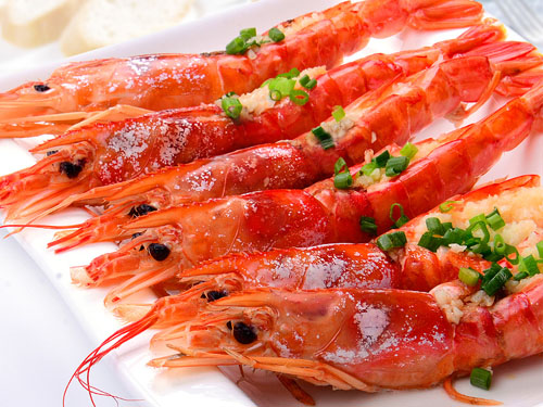 2、烧烤:红虾用生姜、葱、盐、胡椒粉、白葡萄酒,腌制5分钟,入烤箱烤8分钟。